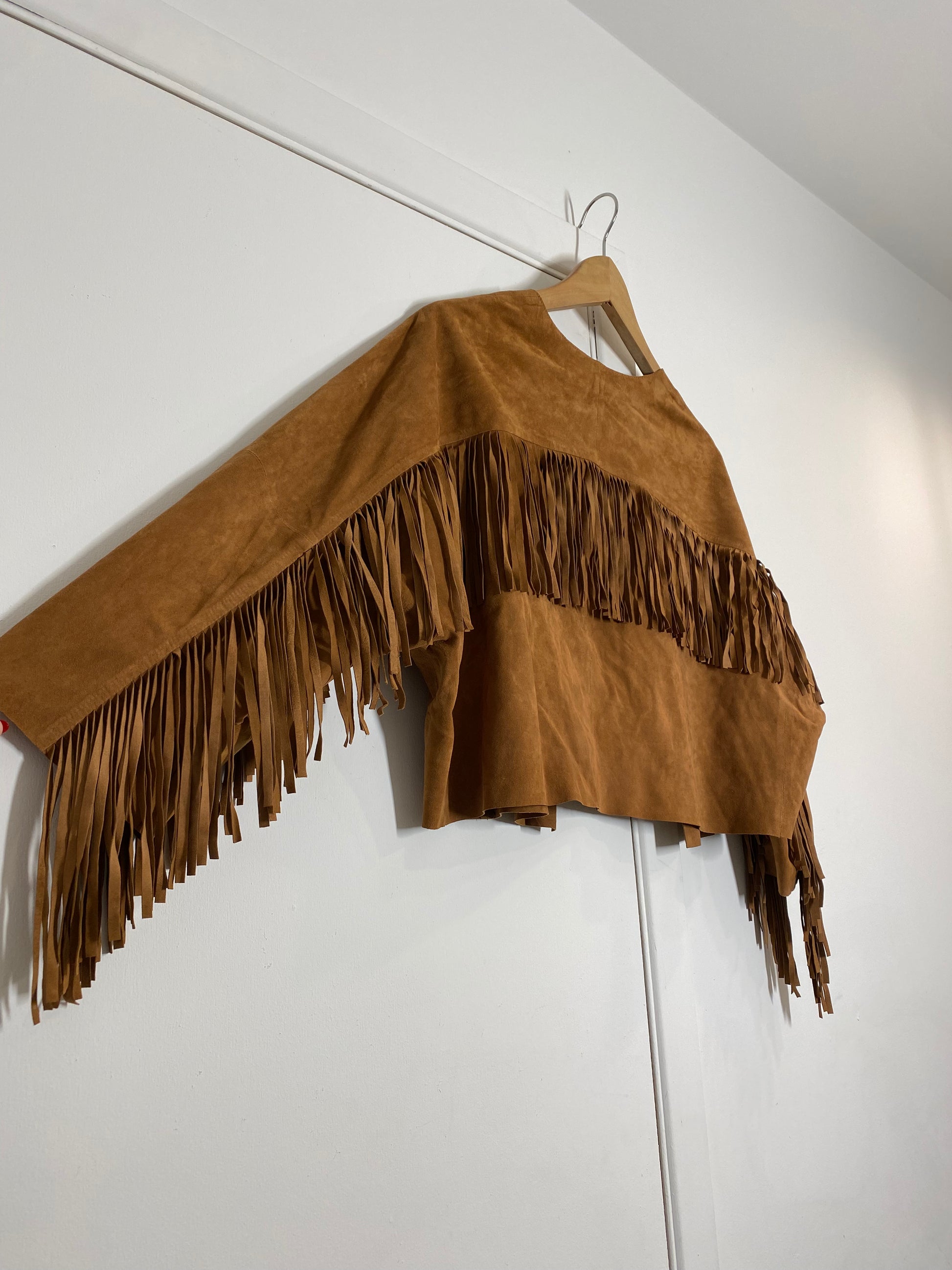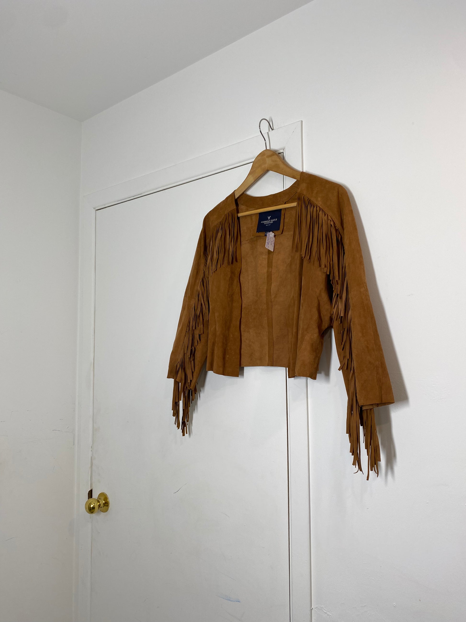 This rare find celebrates both vintage aesthetics along with coming trends. With lots of fringe featured on the Spring/Summer 2026 runways, this vintage American Eagle goatskin cropped jacket is in a classic shade of tan/brown & features fringe on both the front & back.