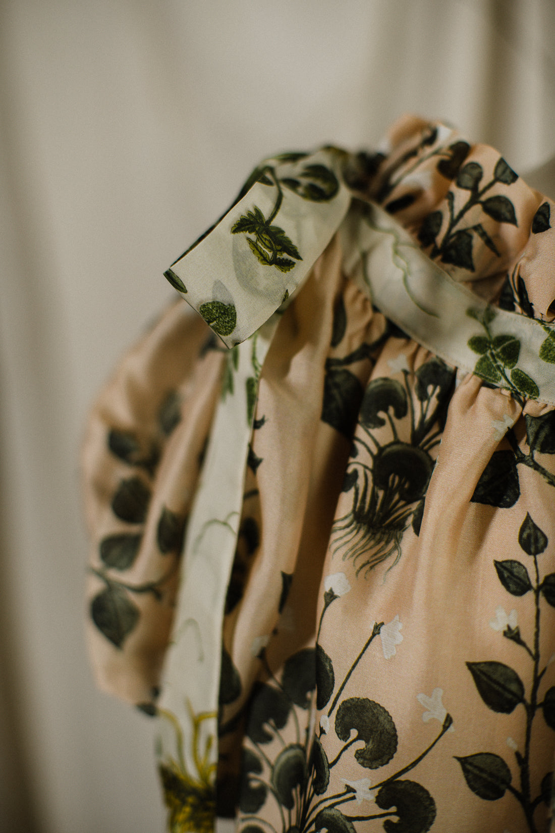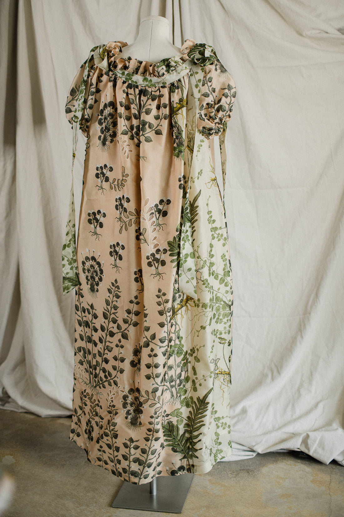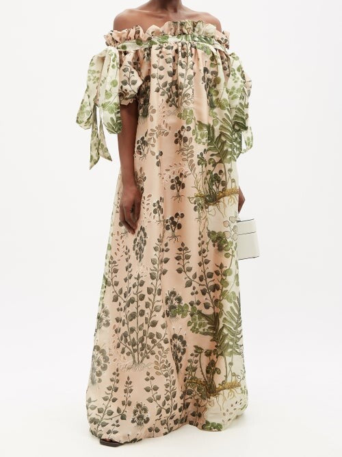 Crafted from floral-print silk organza with a ruffled off-the-shoulder neckline & pastel pink lining, Biyan's cream "Garalds" dress combines modern design with a romantic silhouette.