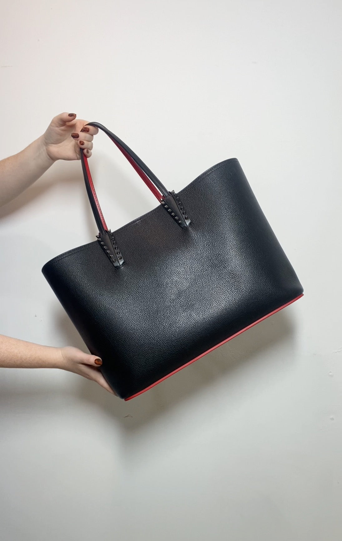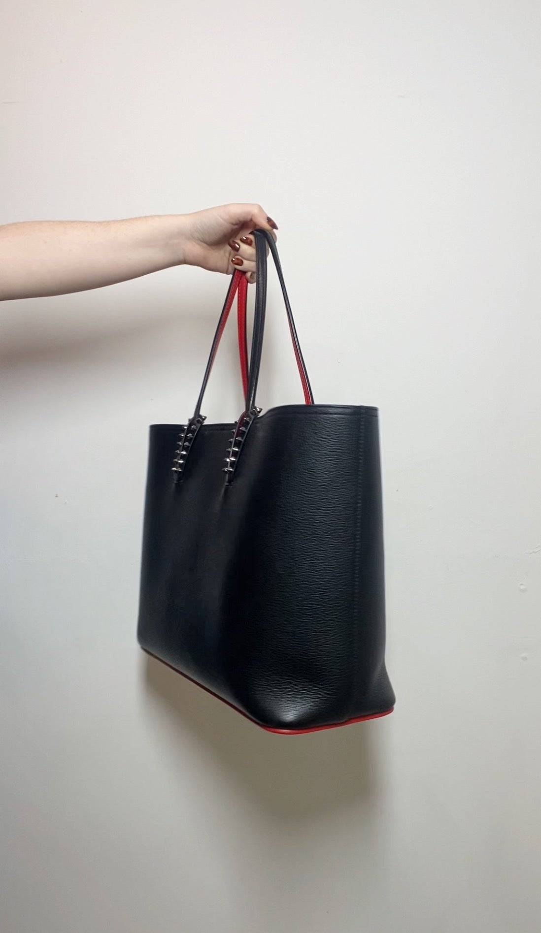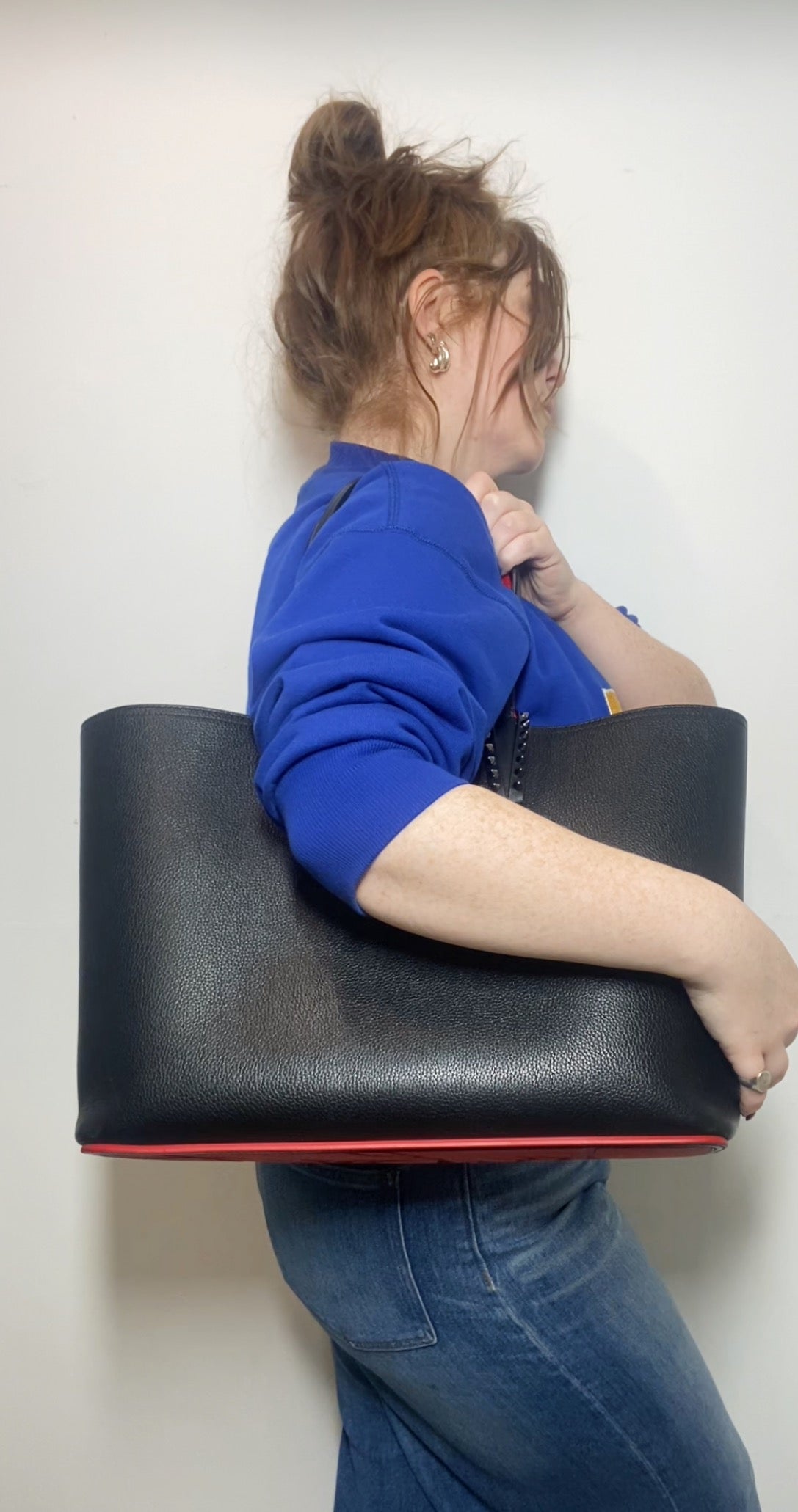 This preloved “Cabata” black leather tote-style bag from Christian Louboutin is the perfect answer. The beautiful black pebble leather bag is in mint condition & features a sleek & simple design that will fit literally everything you need including a laptop if desired. The straps feature silver studs around the bottom giving that tiny bit of edge to make this piece a little more funky & interesting. The interior of the straps as well as the interior of the bag is done in the iconic Louboutin red & comes with an interior pouch for extra storage.