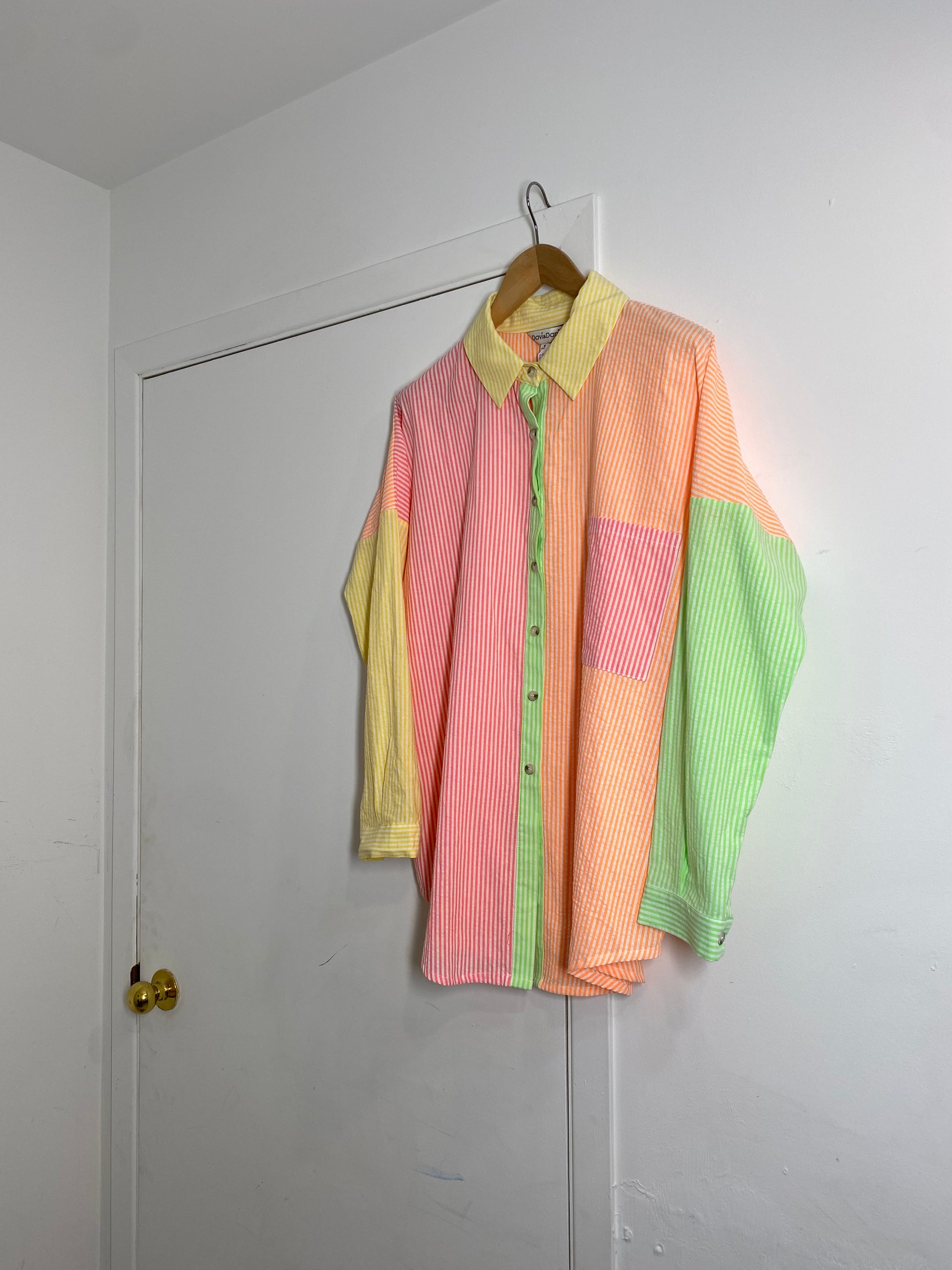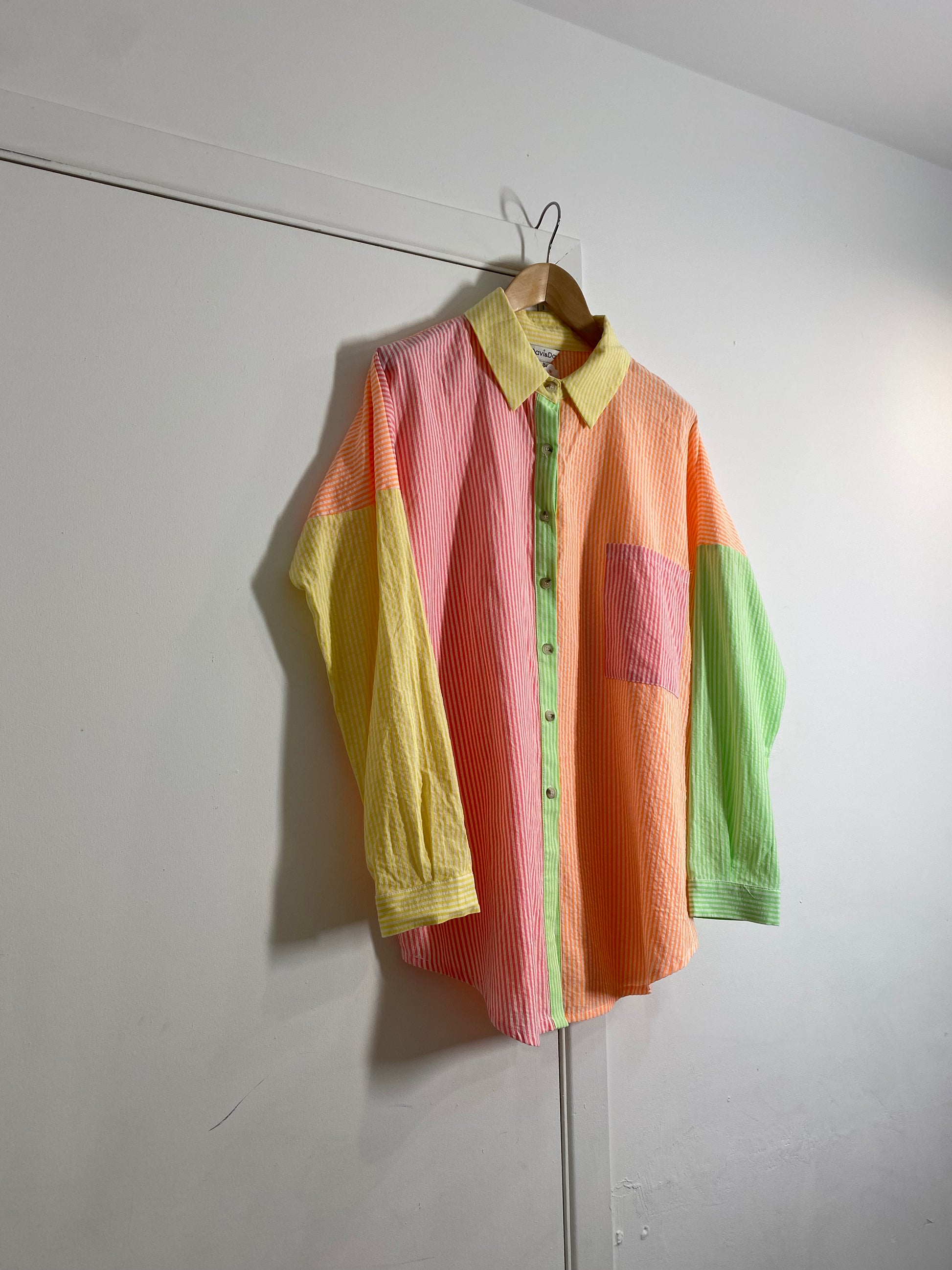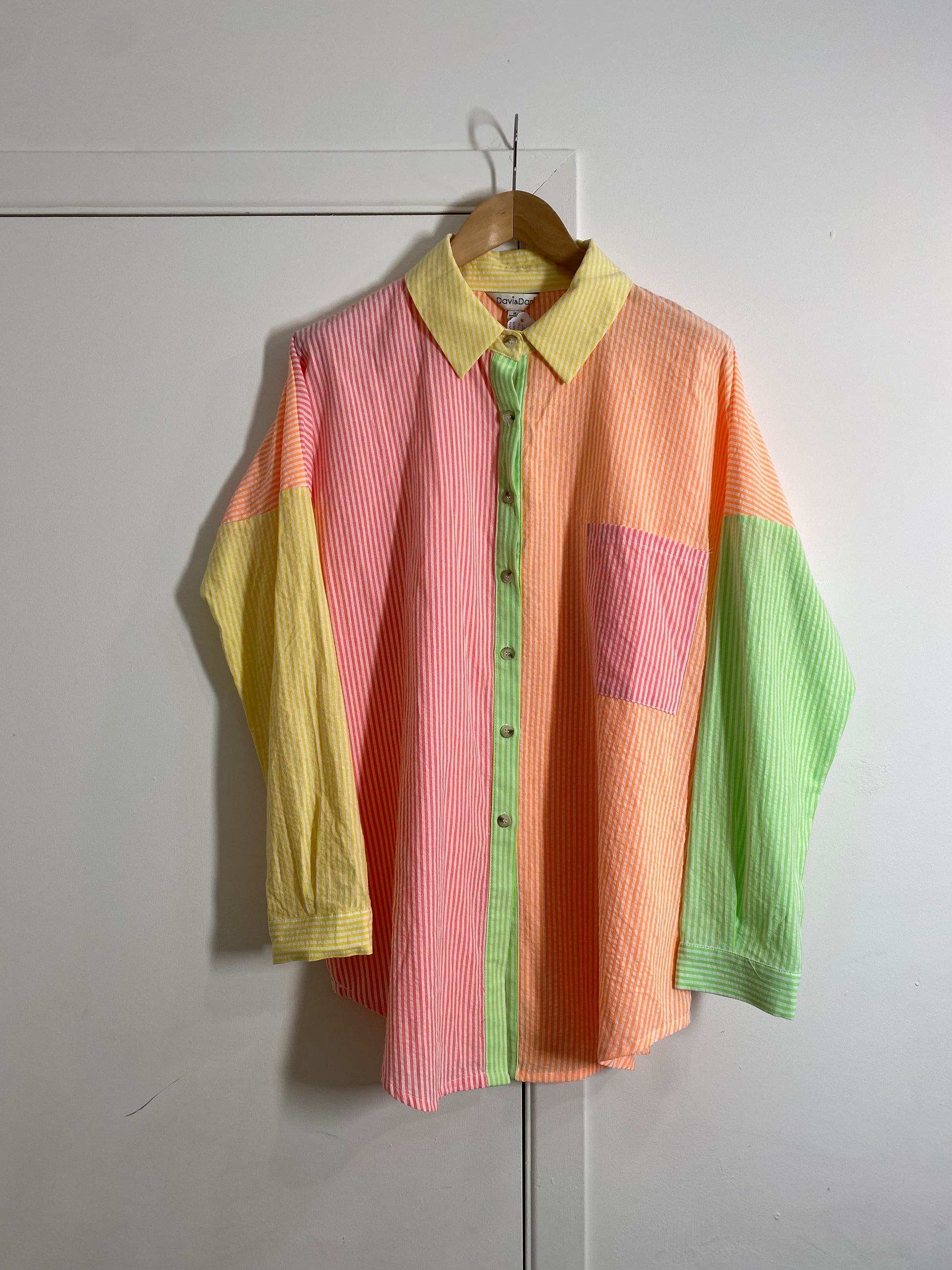 If you love colour, look no further than this amazing multicolour sherbet palette pinstripe top. Featuring shades of yellow, pink, green & peach, this lightweight oversized button up is great on its own with jeans, left open with a t-shirt underneath & it is also great under a sweater or sweater vest during the cooler months.