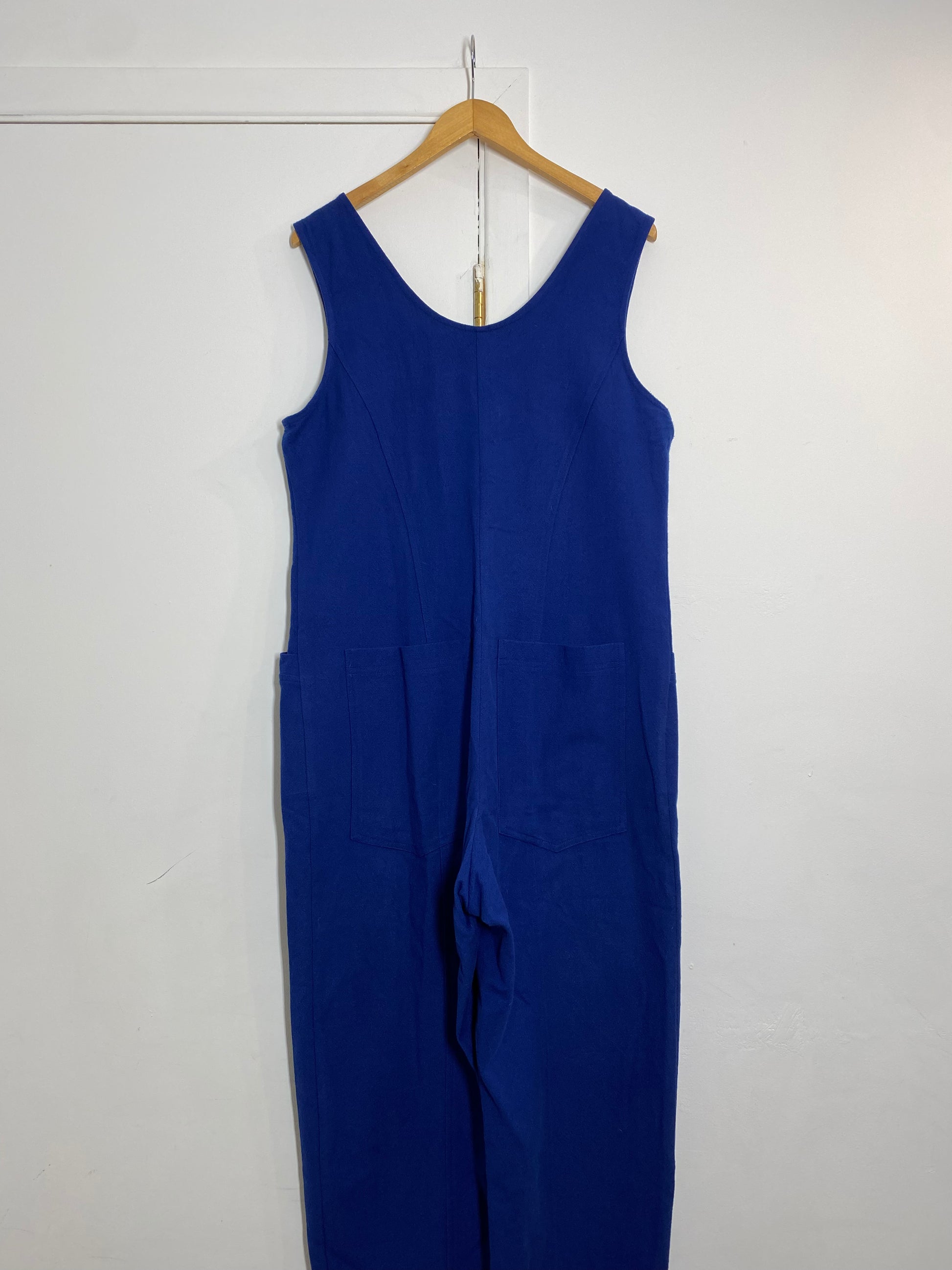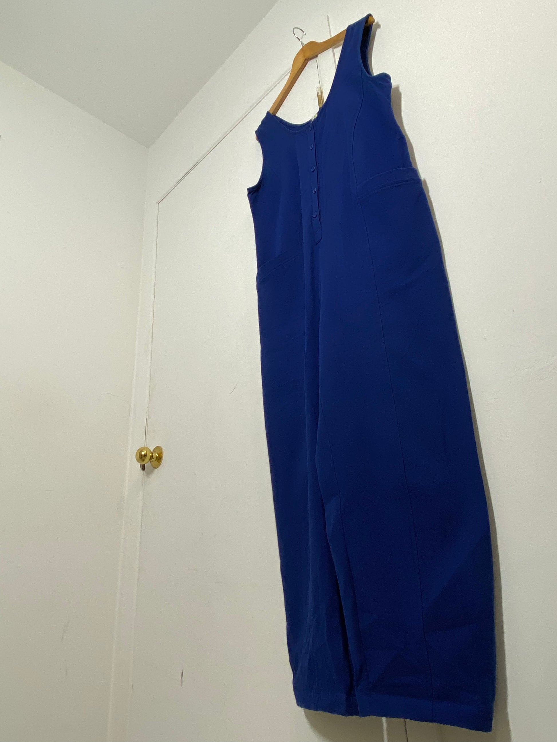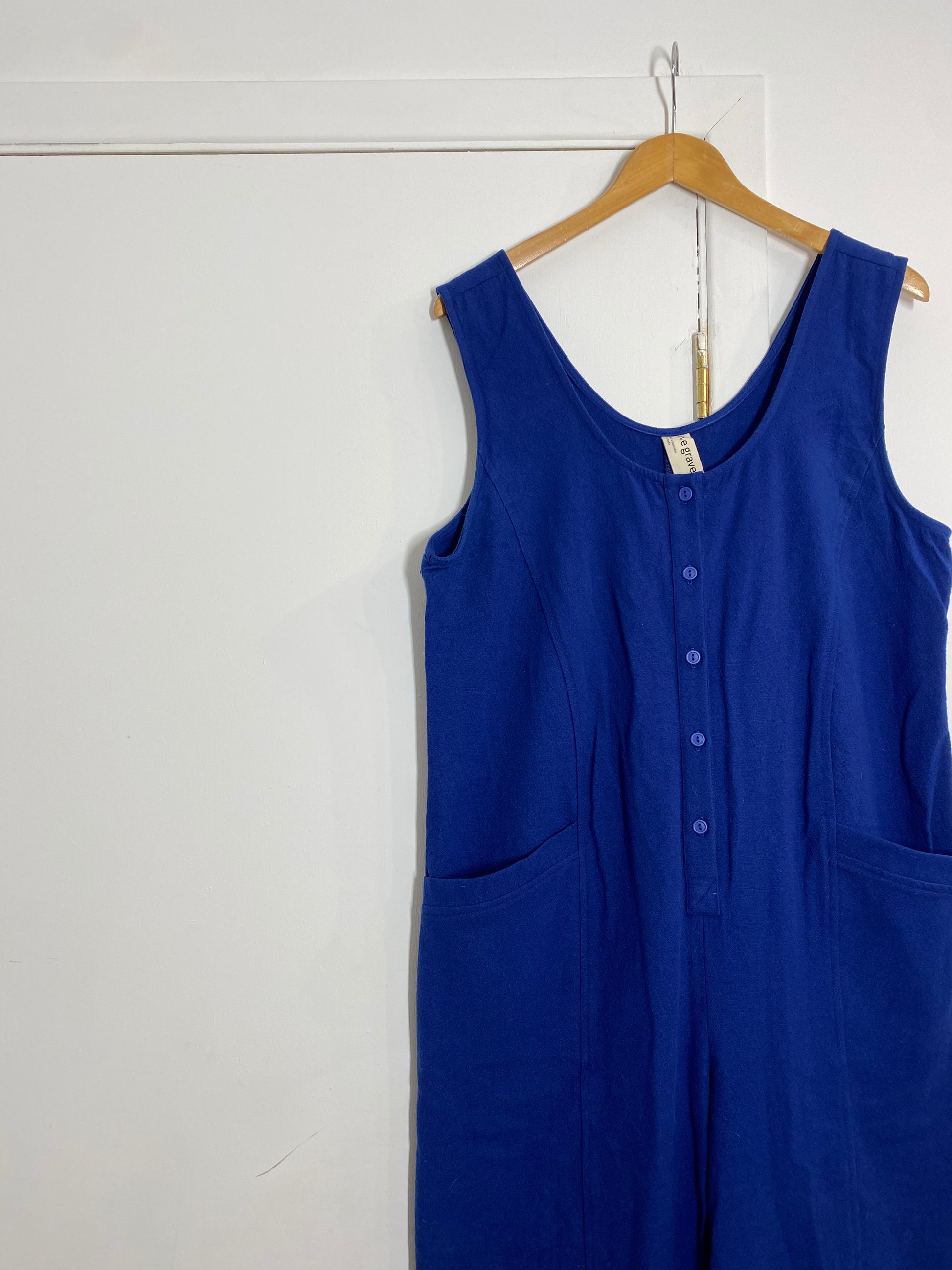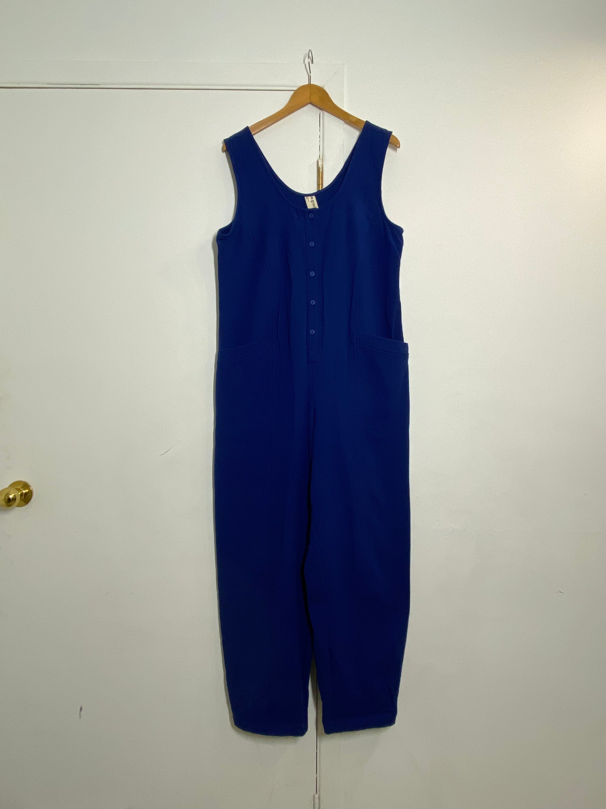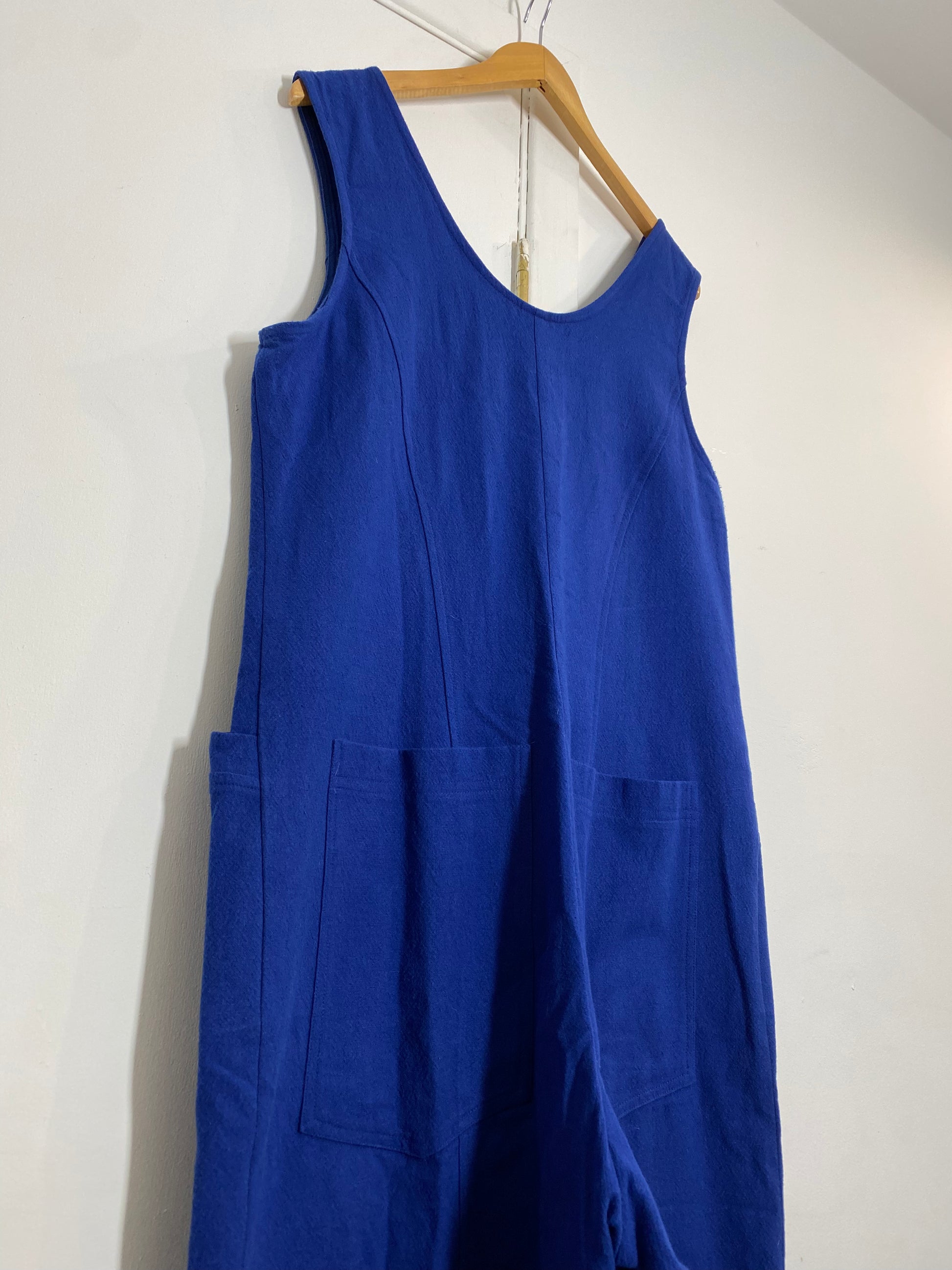 In arguably the most perfect shade of cobalt blue, this super cozy jumpsuit is cut in an oversized sleeveless fit & features a button up front & front & back pockets. Layer with a tshirt underneath, a turtleneck or a chunky colourful knit sweater to layer up for the Fall temps while still looking stylish.