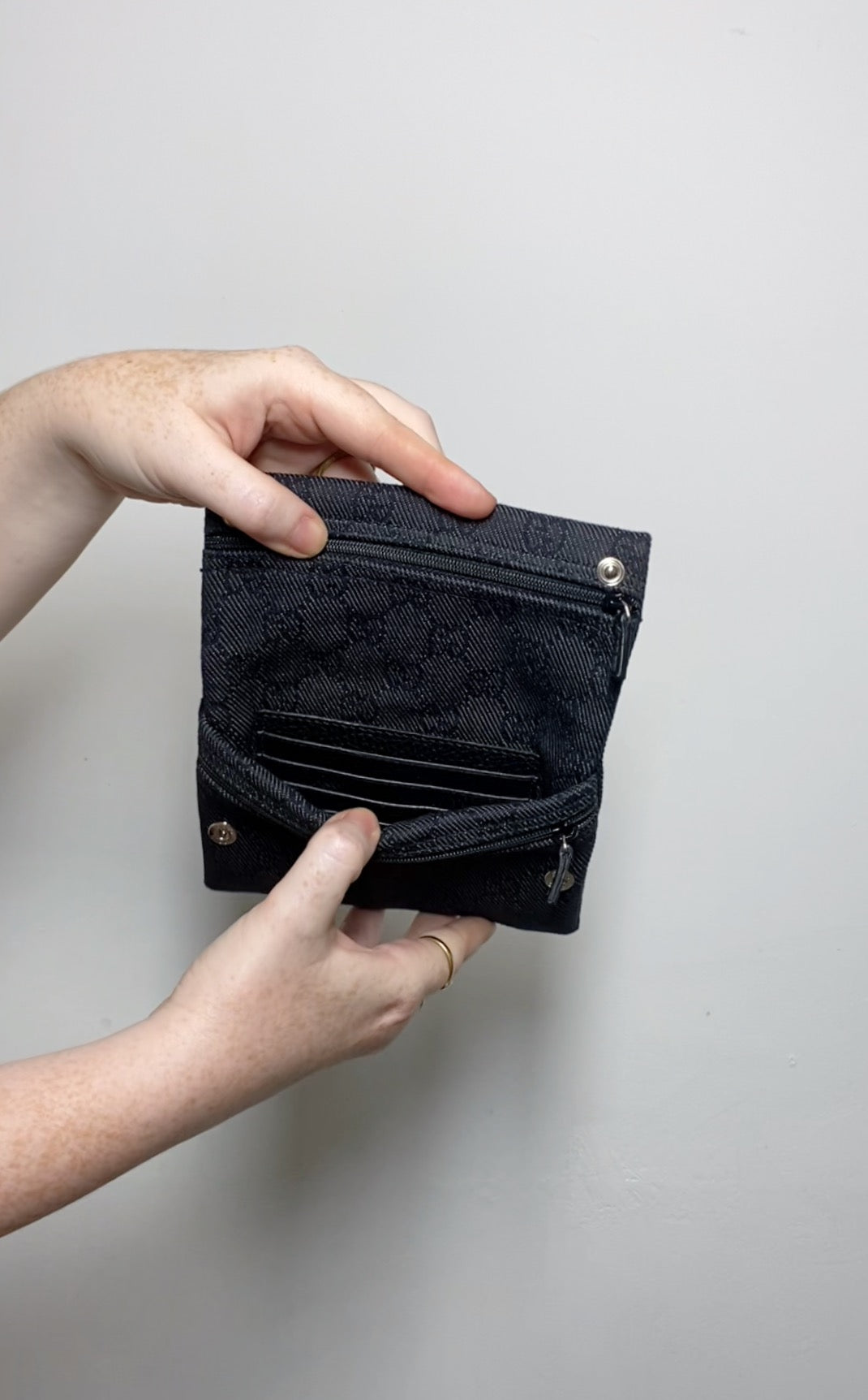 The black & grey denim material features the iconic “GG” print & snap button closure. The wallet opens to three storage compartments. The top zip pocket goes through length of the wallet which makes it perfect for bills or other similar items. The second zip is a smaller pocket & behind that flap features card slots & room for a passport.
