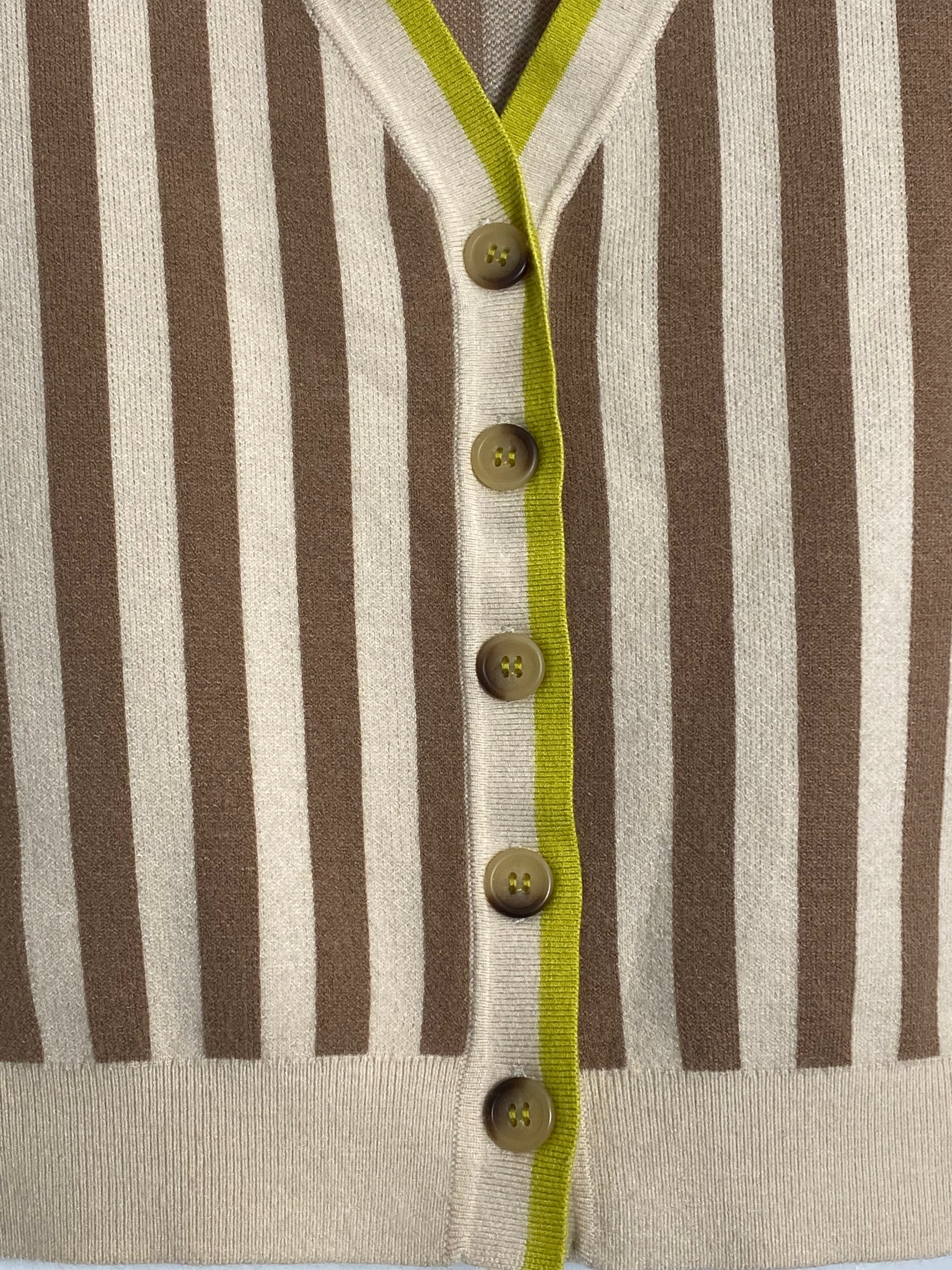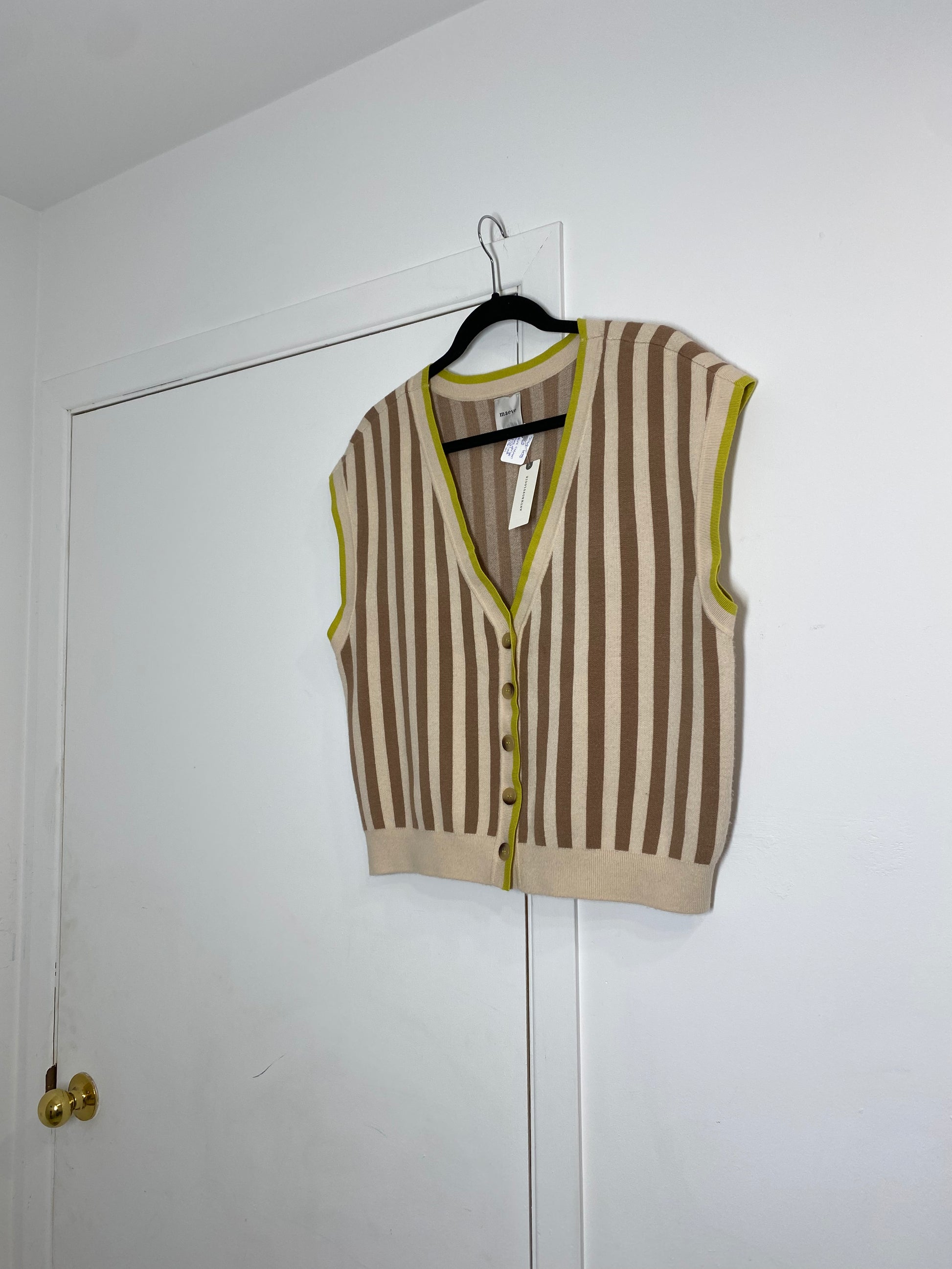 This oatmeal, light brown & chartreuse button up striped sweater vest from Maeve is the perfect piece for Fall. Wear on its own with jeans, or layer with a basic white tee, fun turtleneck & more. This super soft lightweight tight knit has a generous oversized fit & goes well with dresses, jeans & everything in between.