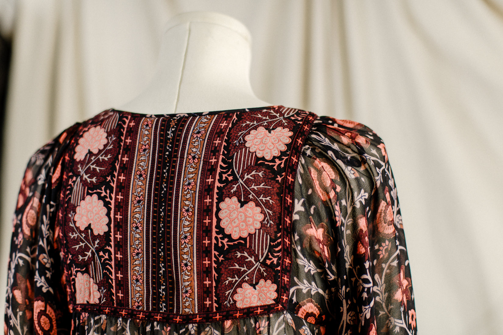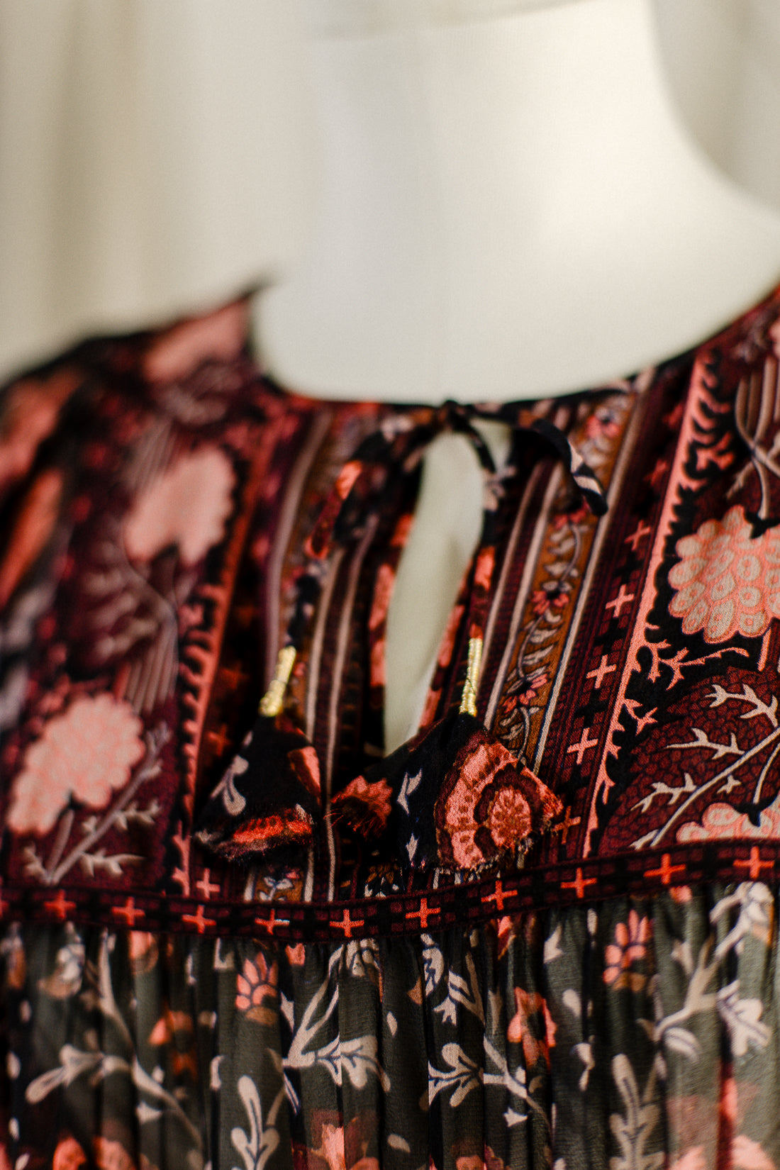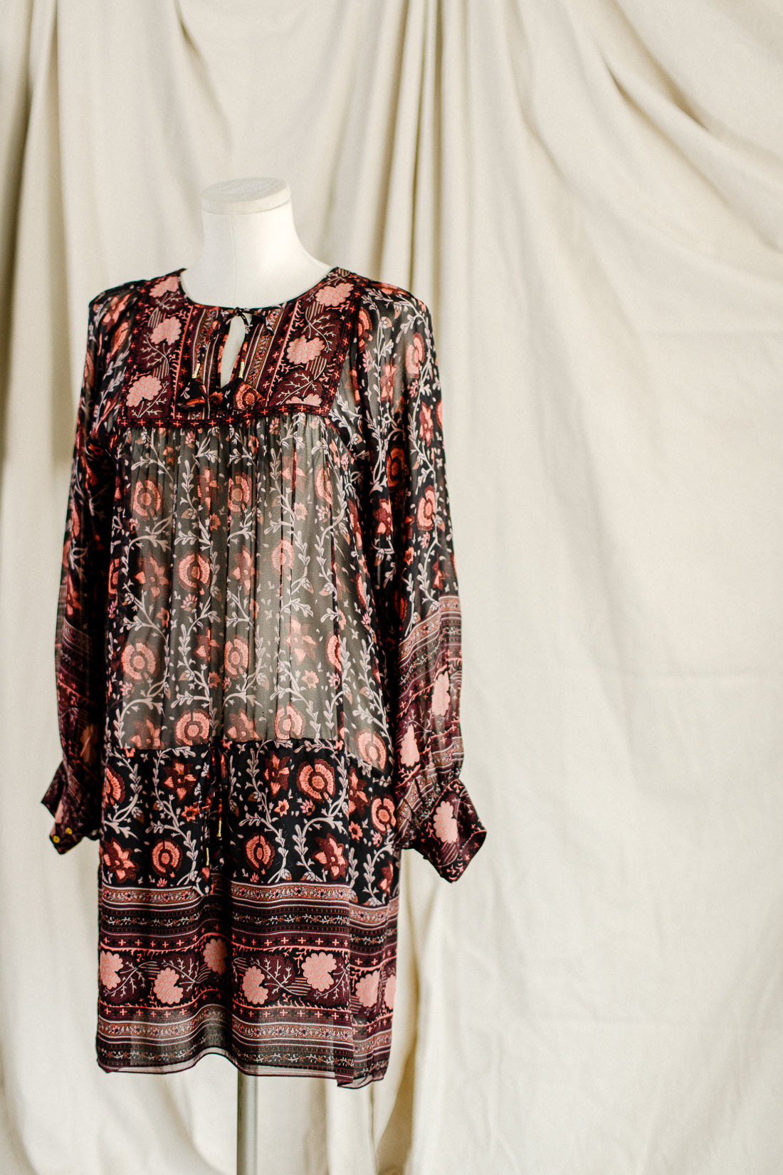 Turn heads in this gorgeous preloved 100% silk dress by Ulla Johnson. This black dress features a floral print motif all over the dress with shades of burgundy & cream. This very lightweight piece is sheer so you can play with how you style it. This dress has a bit of a boho chic vibe which is perfect for summer.