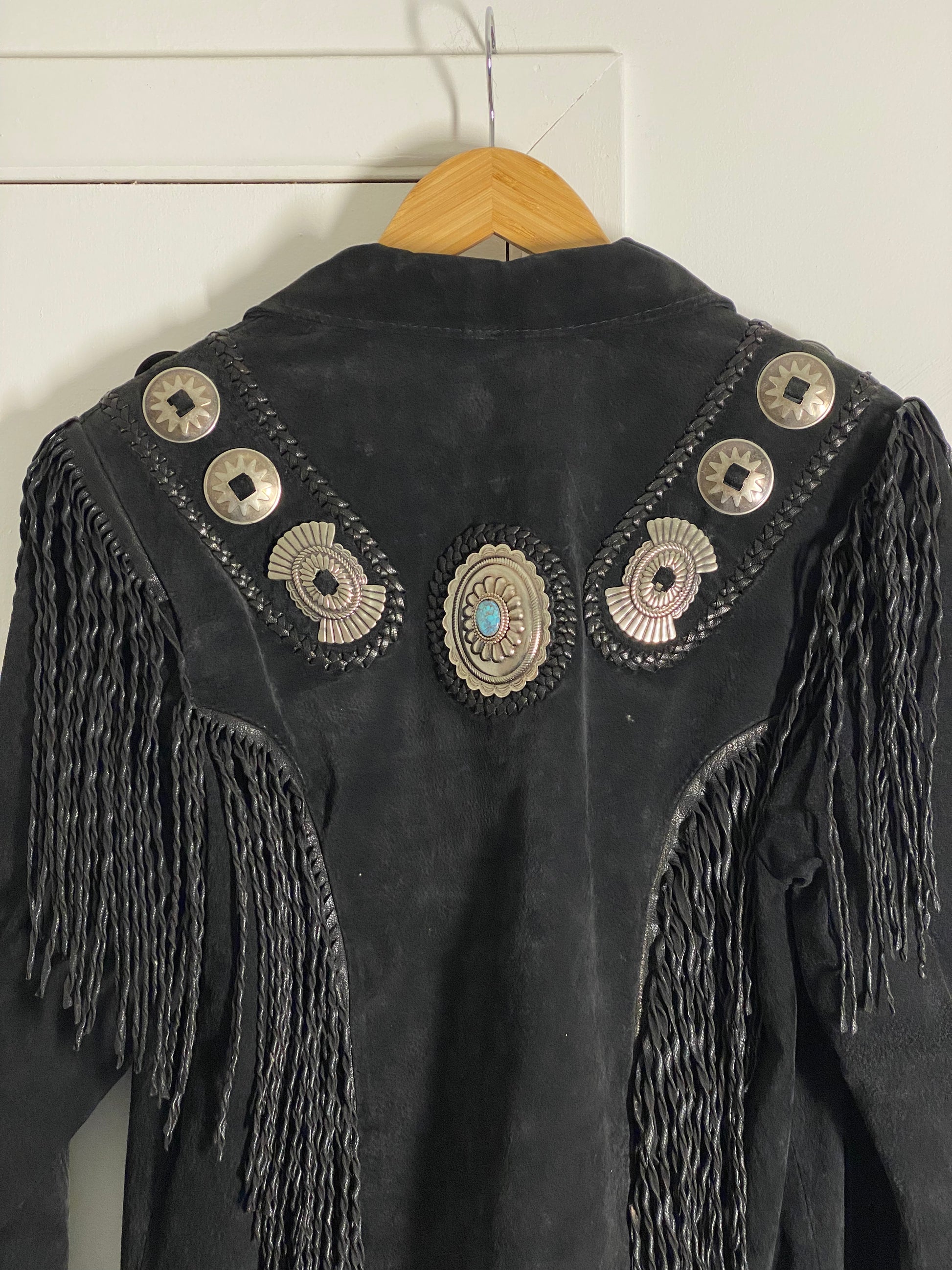 This black suede jacket features spun fringe on the arms & the back of the jacket as well as silver embellishment on the front & back with one of the silver pieces featuring turquoise in the centre. With a button up front, this incredible piece is not only a super cool & beautiful jacket that you will have forever but also a piece of fashion history. A lot of the Pitic Leather pieces are considered collection items.