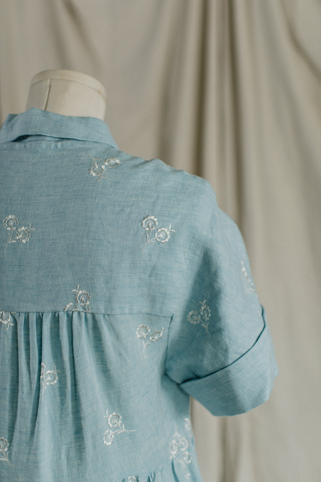 This gorgeous preloved soft blue "Helena" dress by Erdem is the epitome of sophisticated summer styles. This tiered maxi dress is constructed of linen-voile & features cream floral embroidered all over the piece. The top has a button-down shirt shape with a collar, while the maxi skirt is gathered into pleated tiers with a pretty scalloped hem.