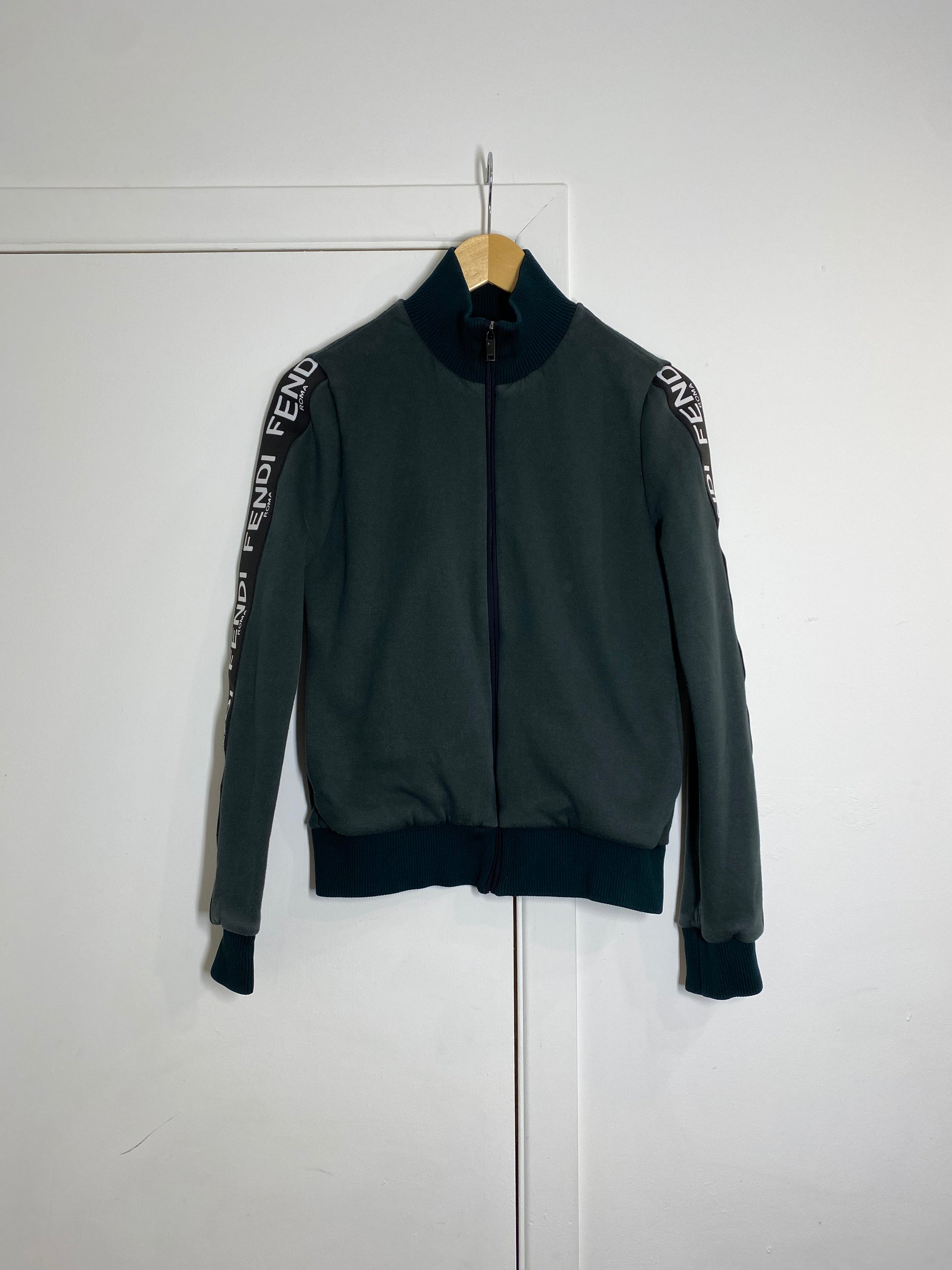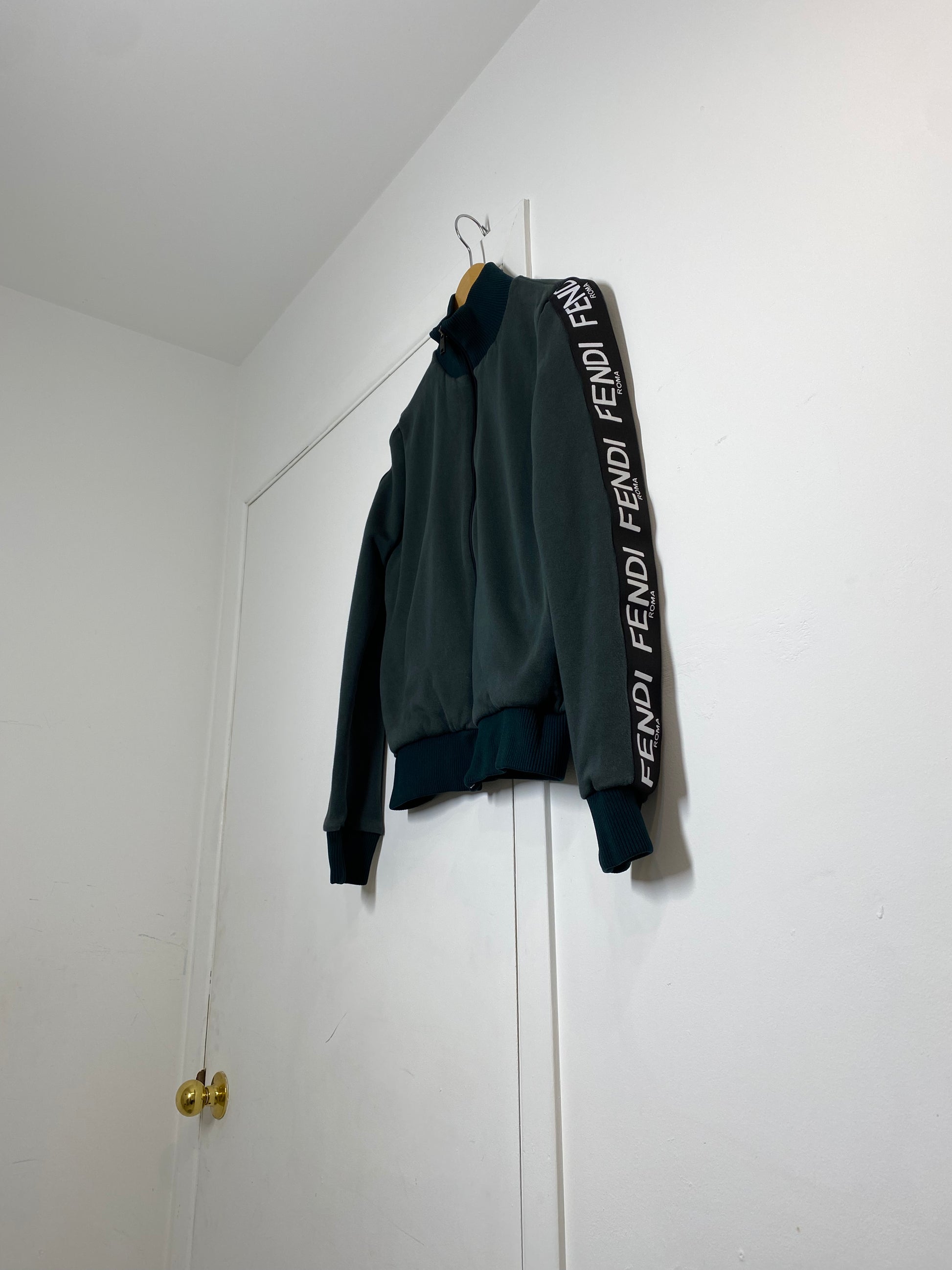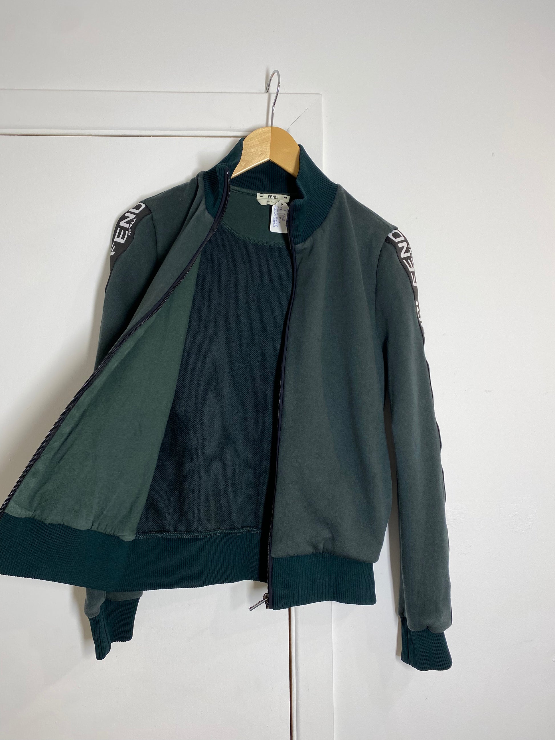 With black zipper, cuffs & collar as well as black & white "Fendi" trim on the arms, this sweatshirt is an easy number to dress up or down. To dress up, pair with a black blazer or leather jacket & black wide leg jeans with a heeled boot or a really cool pair of sneakers.
