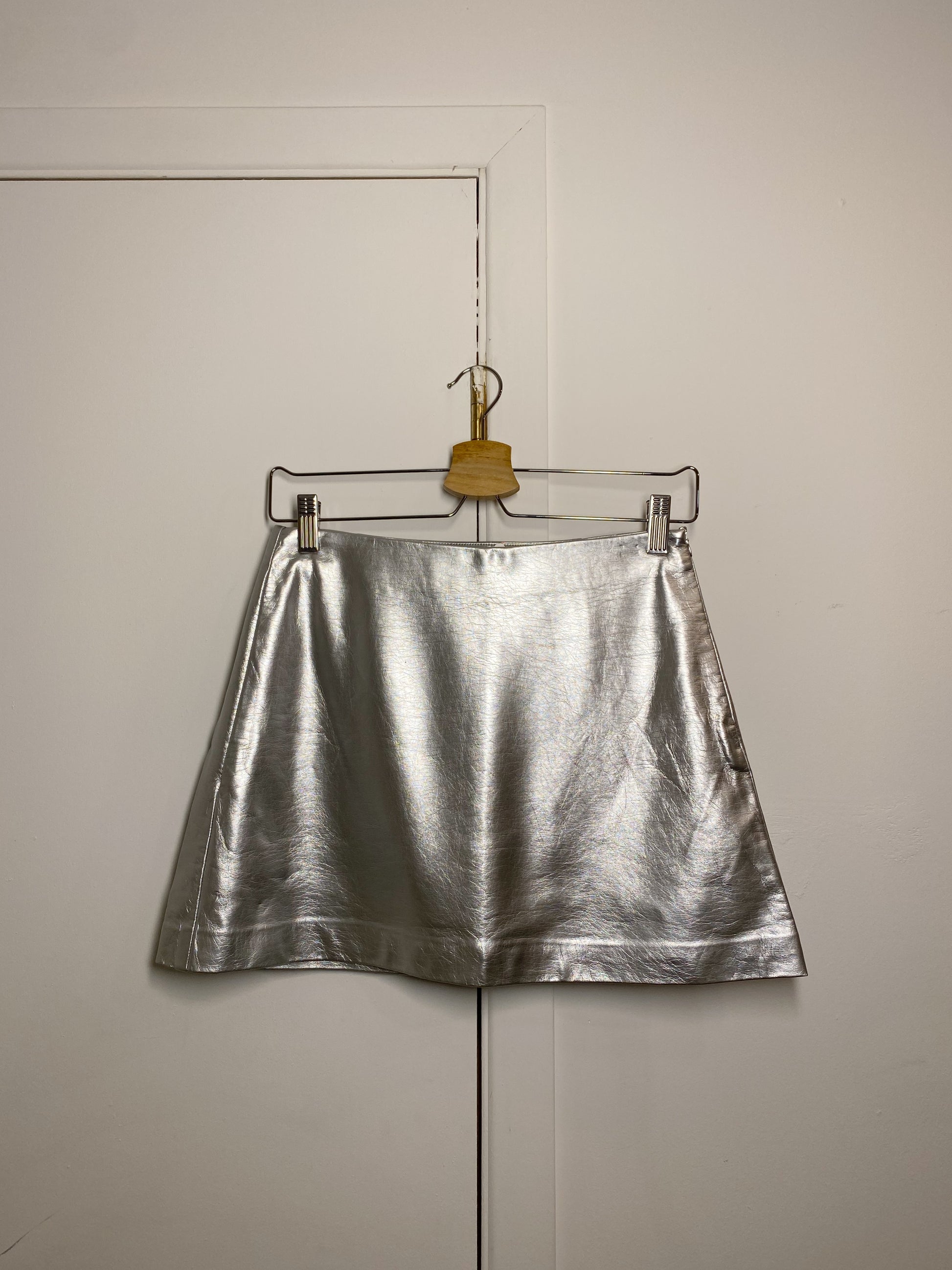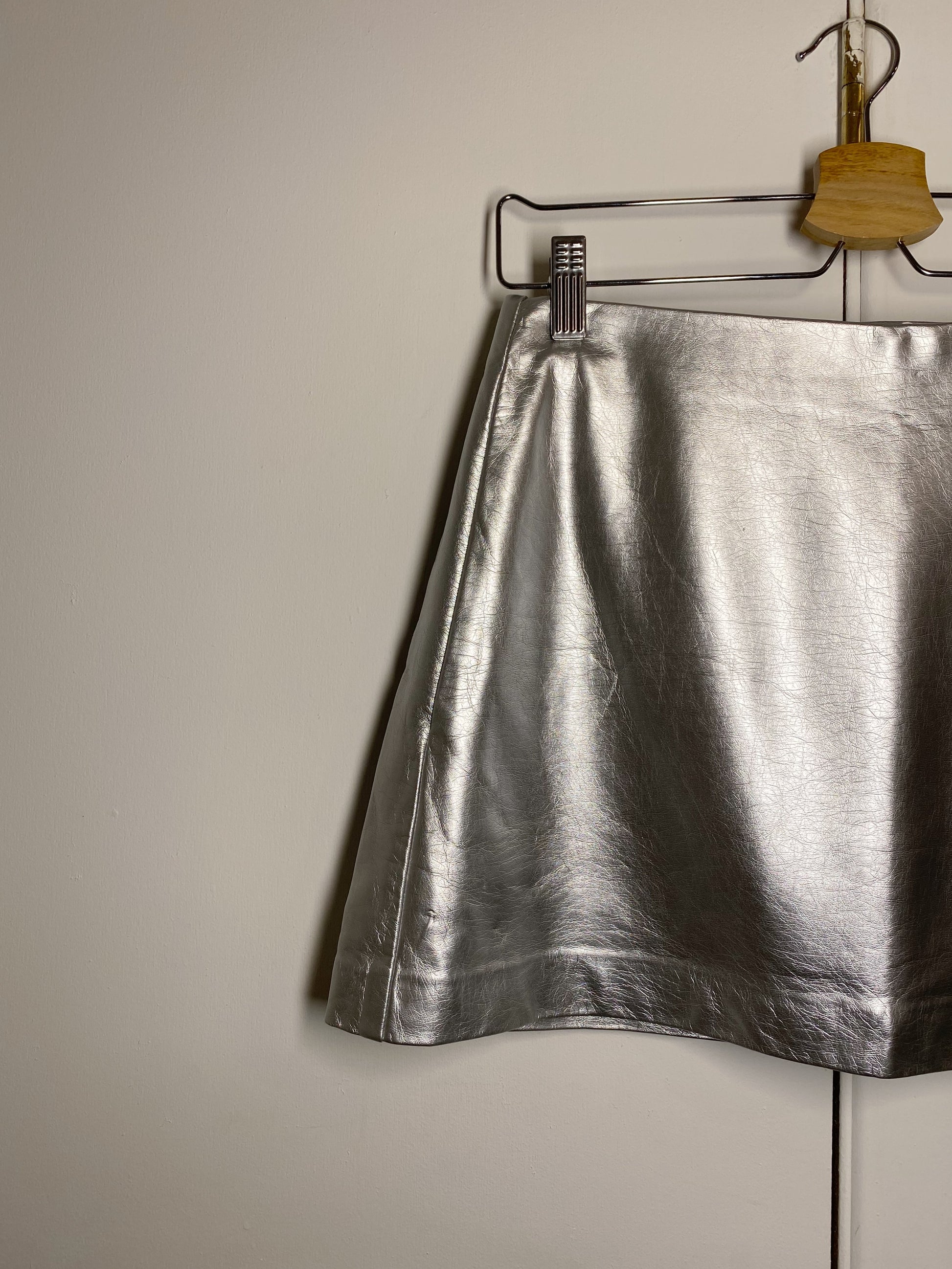 From their Trafaluc collection, this super fun preloved silver metallic faux leather skirt from Zara is a super fun piece for Fall.